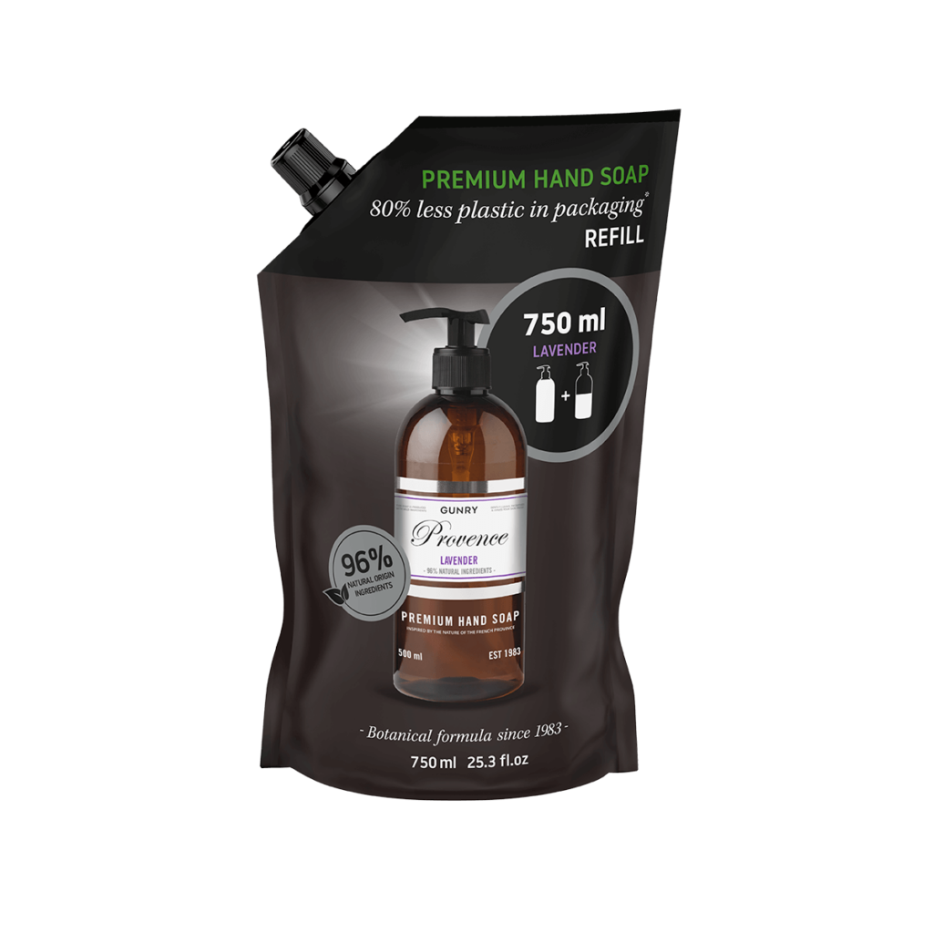French Collection från Gunry är en serie designade och prisvärda handtvålar med dofter från de franska provinserna nu i en större och mer hållbar förpackning med 80% mindre plast jämfört med flaska. Från Provence kommer inspirationen till doften Lavender. Med den smarta refillförpackningen fyller du enkelt på din tidigare köpta pumpflaska från French Collection eller fyller på din egen tvålpump.