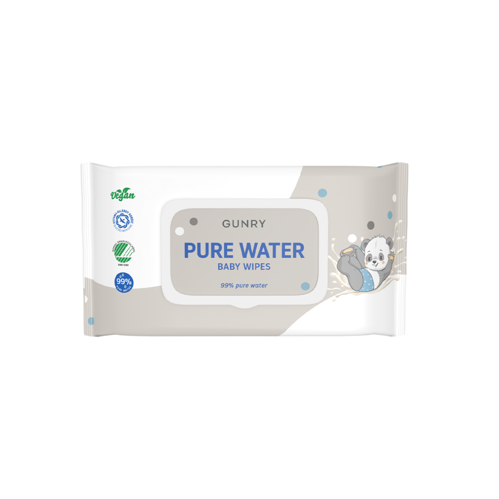 Gunry Pure Water Baby Wipes är skonsamma våtservetter speciellt framtagna för bebisar. Produkten innehåller 99% vatten och är certifierad med både Svanen och Astma & Allergiförbundet. Förpackningen har ett praktiskt lock för smidig användning och återförslutning.