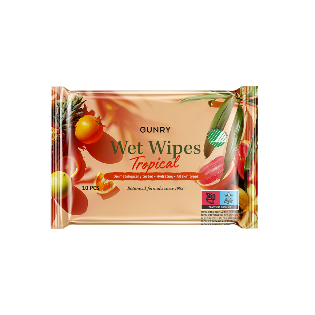 Wet Wipes Tropical från Gunry är Svanenmärkta våtservetter med doft av läskande tropiska frukter. Den återförslutningsbara förpackningen innehåller 10 stora och mjuka servetter som är lätta att ta med. De rengör snabbt, återfuktar och lämnar en fräsch doft. Antal: 10 st.